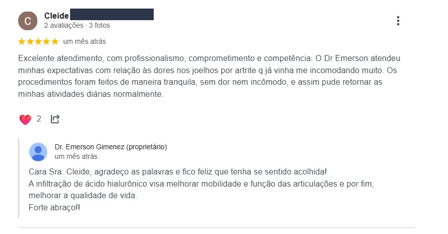 Para ver minha avaliação e mais depoimentos de pacientes sobre meu trabalho, te convido a conhecer meu perfil no Google, clicando aqui.